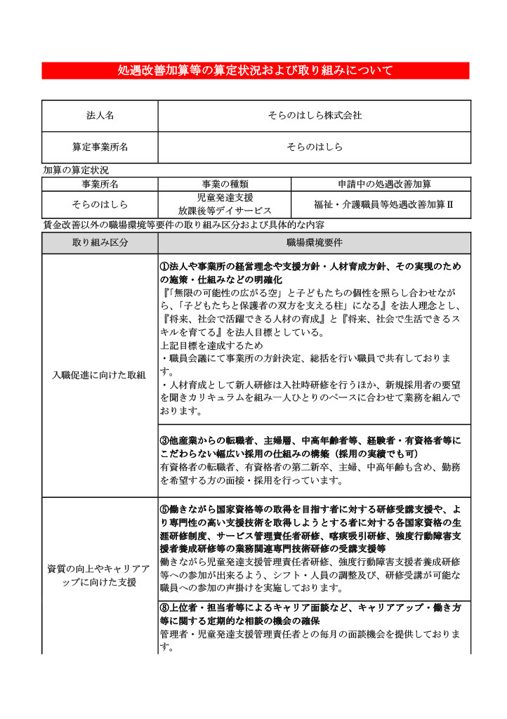 福祉・介護職員処遇改善加算Ⅱの取組項目と当事業所の実施状況について 2025 11/19 2025年11月19日 お世話になっております。『そらのはしら』でございます。当事業所で行っている福祉・処遇改善加算Ⅱの取組項目と実施状況になります。皆様、ご確認の程、よろしくお願いいたします。 未分類 よかったらシェアしてね! URLをコピーしました! URLをコピーしました! コメント コメントする コメントをキャンセルコメント ※ 名前 ※ メール ※ サイト 次回のコメントで使用するためブラウザーに自分の名前、メールアドレス、サイトを保存する。 画像に表示された文字を入力してください